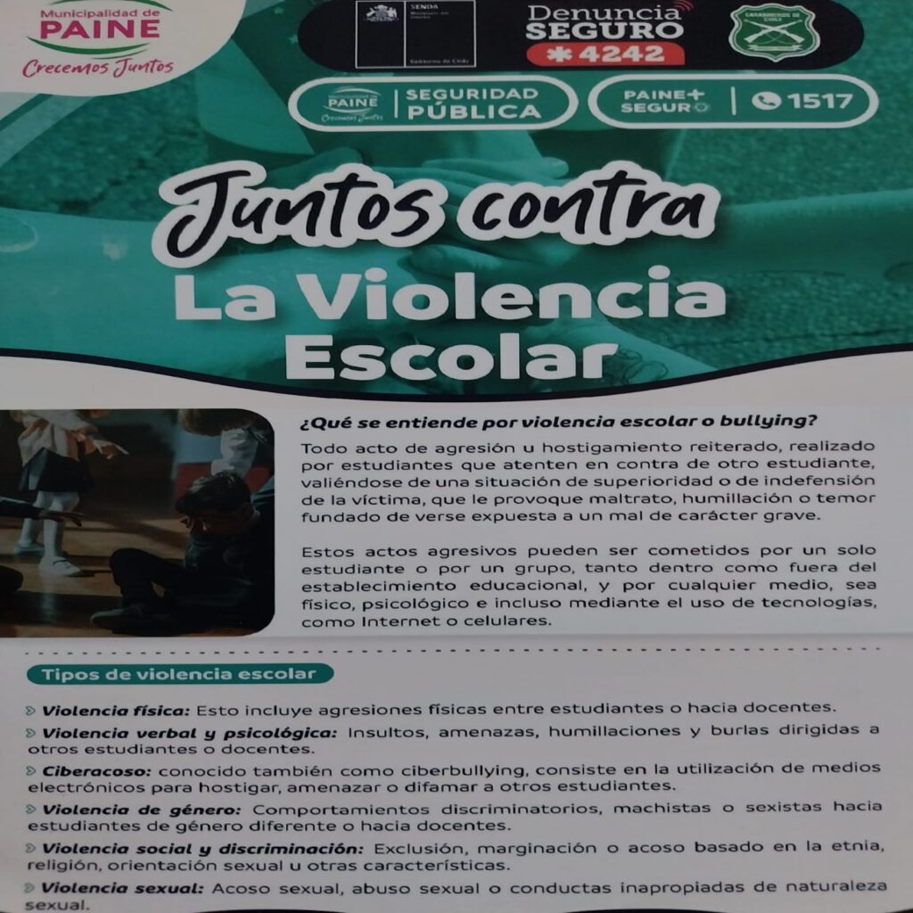 El día viernes 23 de mayo nos visitaron funcionarios de la Tenencia de Carabineros de Champa y del programa Paine Seguro, con la finalidad de que los estudiantes de primero y segundo medio se informarán acerca de la charla educativa “Juntos contra la violencia escolar”, dando énfasis a la importancia de la responsabilidad en los actos que se realizan, en virtud de la responsabilidad penal.