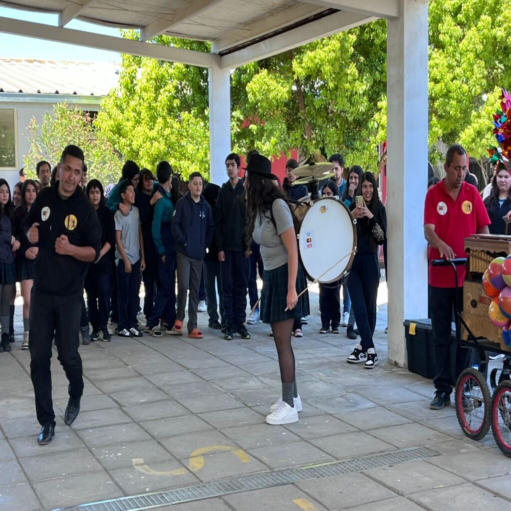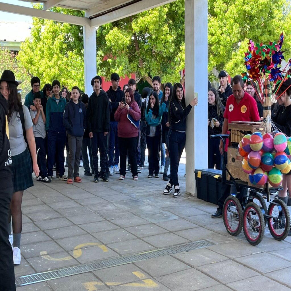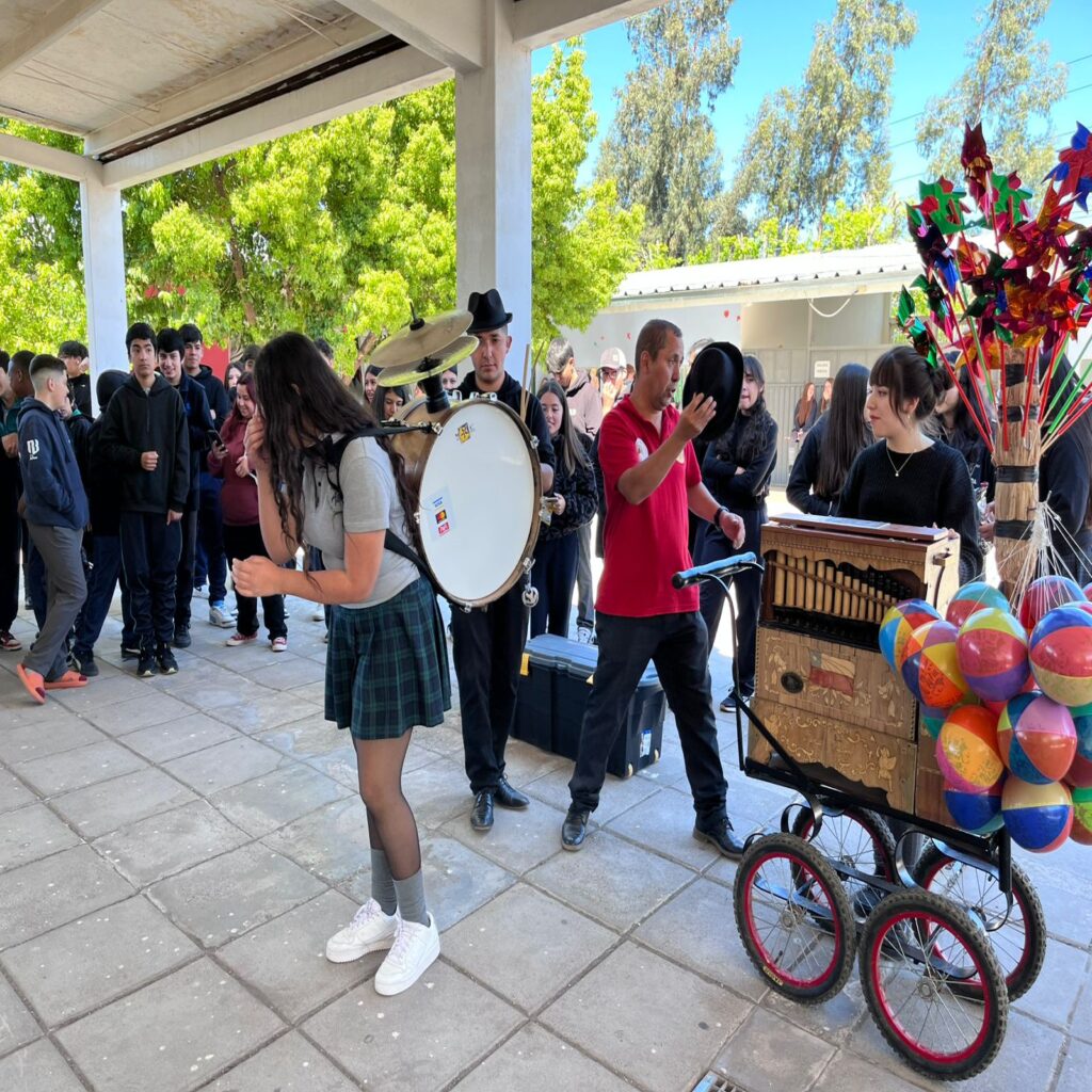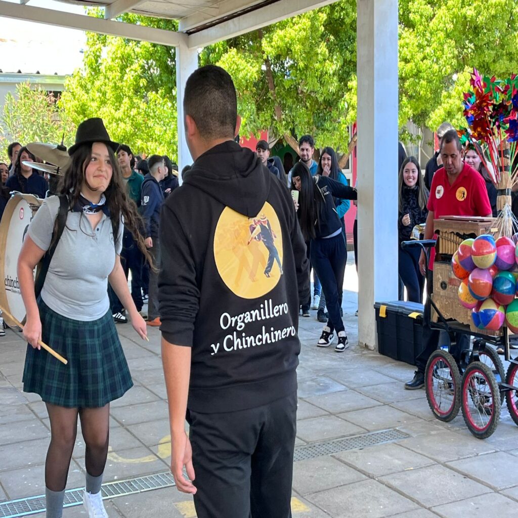 El sonido característico del organillo, acompañado por el compás enérgico de los chinchineros, transformó los patios en un verdadero escenario cultural. Los estudiantes disfrutaron de una presentación que, además de entretener, permitió acercar a las nuevas generaciones a una expresión patrimonial única.